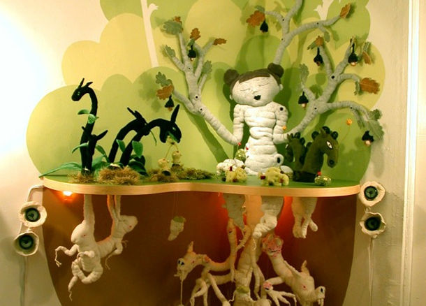 Notes: Presented at National Product Gallery in San Francisco, CA, 2005. Installation included a large fabric sculpture of a fantastical botanical landscape. Created an imaginary sonic environment to match. All sounds created by manipulating human voices. Also designed the speaker setup and sculpted the speaker displays.
